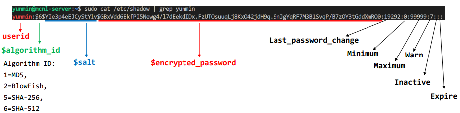 Linux의 /etc/shadow 파일 구조를 보여준다.