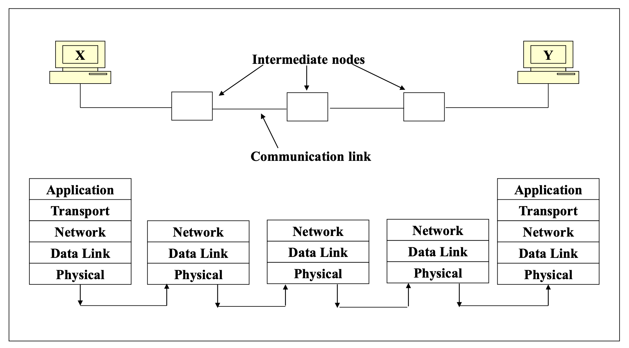물리 계층을 제외한 모든 계층은 같은 컴퓨터의 인접 계층과 통신한다. 실제로 두 컴퓨터 간 전송이 이루어지는 곳은 물리 계층뿐이다.