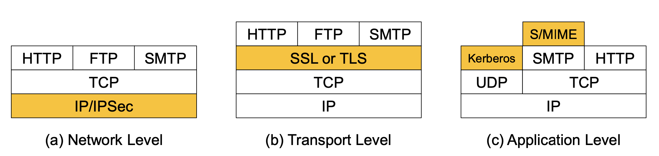보안을 어느 계층에서 적용할 것인지에 따라 여러 접근 방식이 존재한다.