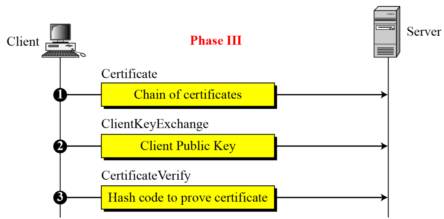 - Certificate (선택): 서버가 요청하면 클라이언트 인증서 전송. 없으면 "no certificate" 메시지 전송