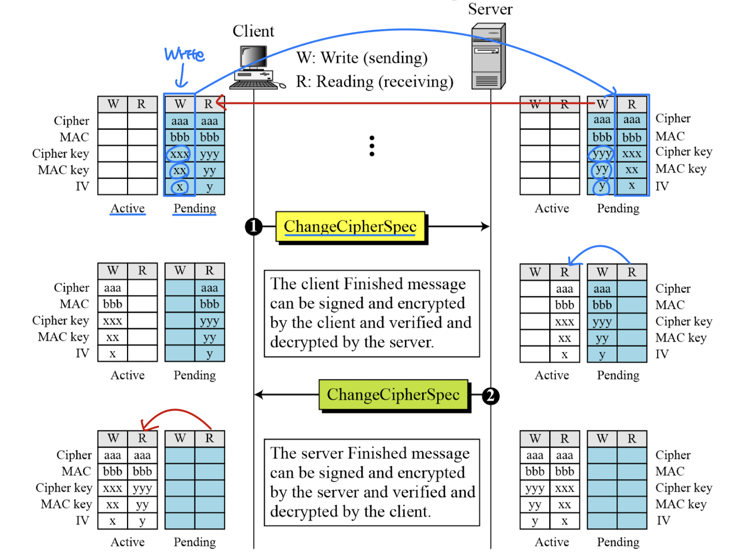 Handshake Protocol 동안 cipher 상태 협상과 암호화 비밀 생성이 점진적으로 이루어진다. 그렇다면 양측은 언제 이 파라미터와 비밀을 사용할 수 있는가?