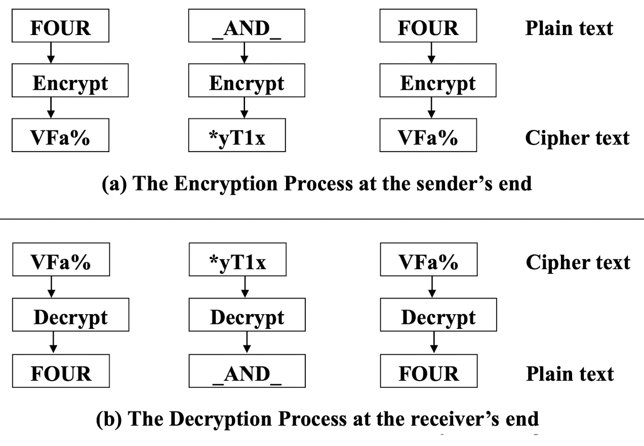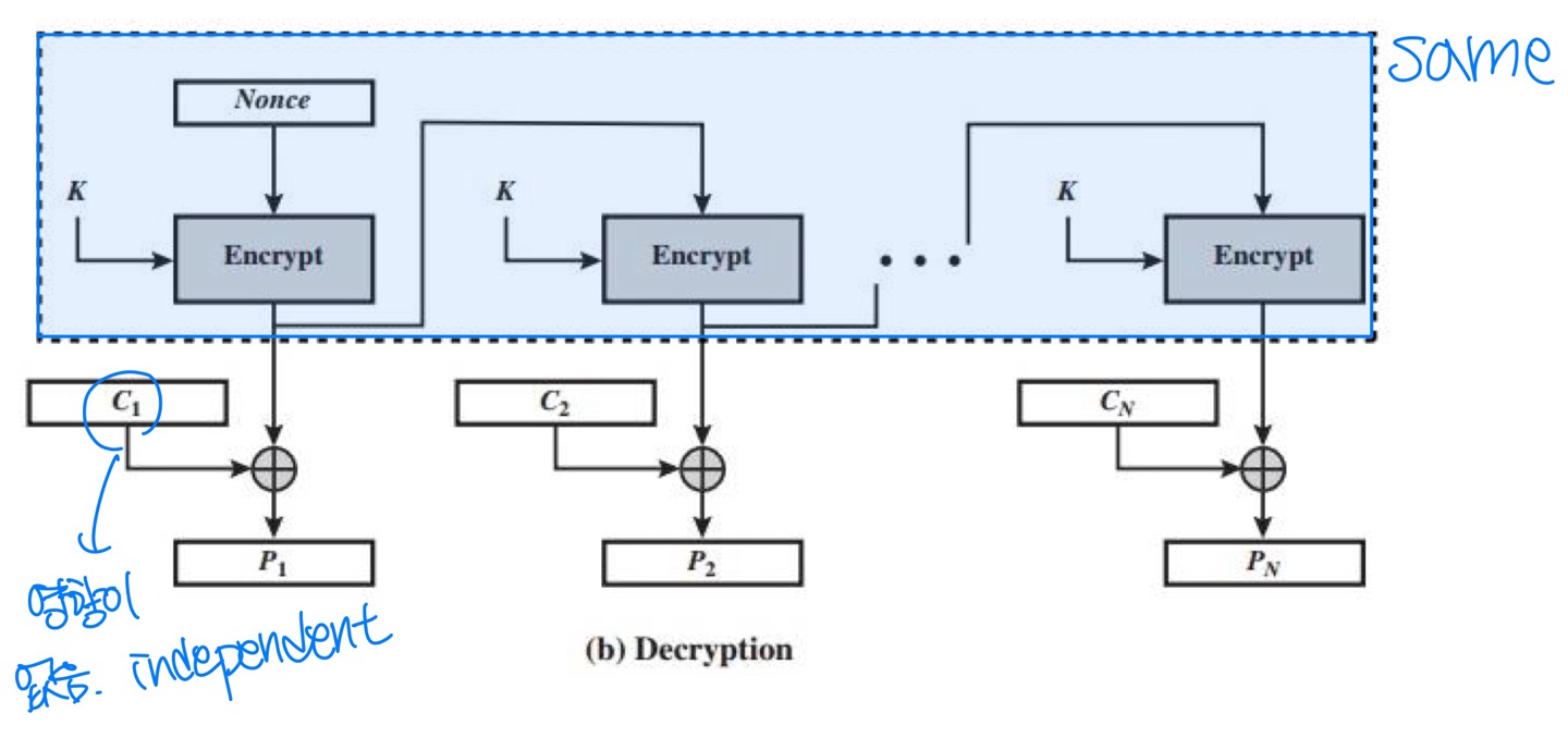 - 양쪽 끝에서 블록 암호가 암호화 모드로 사용됨