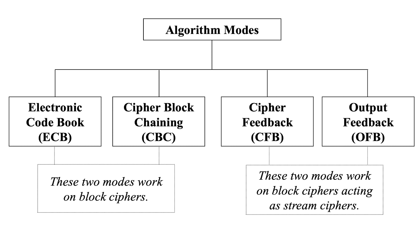 - 알고리즘 모드: 타입이 정해진 후, 암호화의 세부 동작 방식을 결정