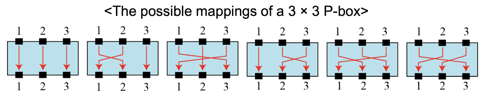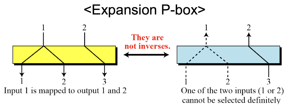 - Expansion P-Box: 하나의 입력이 여러 출력에 매핑될 수 있어, 복호화 시 어떤 입력이 어떤 출력에 매핑되었는지 알 수 없다.
