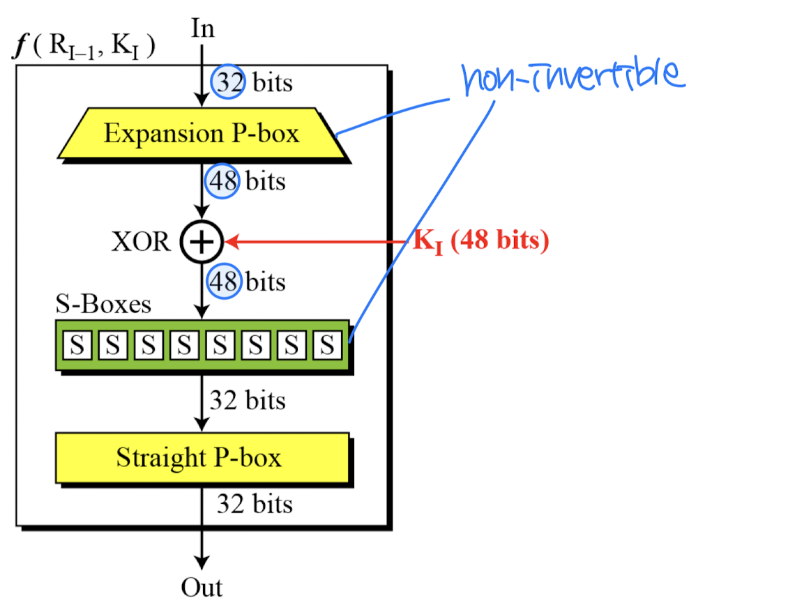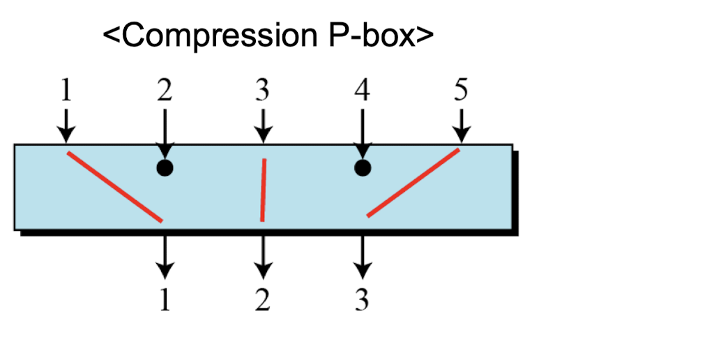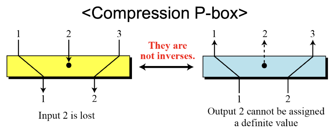 - Compression P-Box: 암호화 시 입력이 버려질 수 있어, 복호화 시 해당 비트를 복원할 방법이 없다.