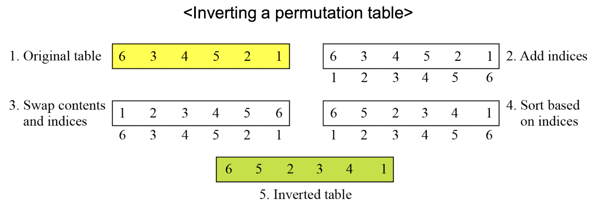 Straight P-Box는 역연산이 가능하다. 아래 그림은 1차원 테이블로 표현된 순열 테이블을 역변환하는 방법을 보여준다.