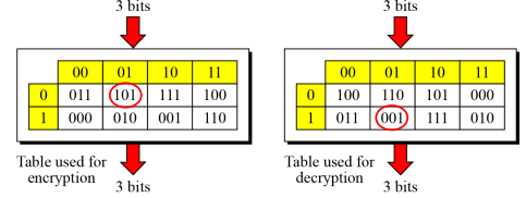 아래는 역연산 가능한 S-Box의 예이다. 왼쪽 박스에 001을 입력하면 101이 출력되고, 오른쪽 테이블에 101을 입력하면 001이 출력되어 서로 역관계임을 알 수 있다.