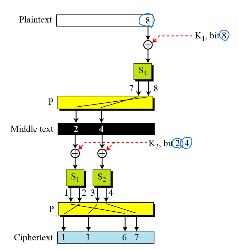 예제: 암호문 비트 1, 3, 6, 7은 키의 세 비트(K1의 비트 8, K2의 비트 2와 4)에 의해 영향받는다. 암호문 비트와 키 비트 사이의 관계가 모호해진다.