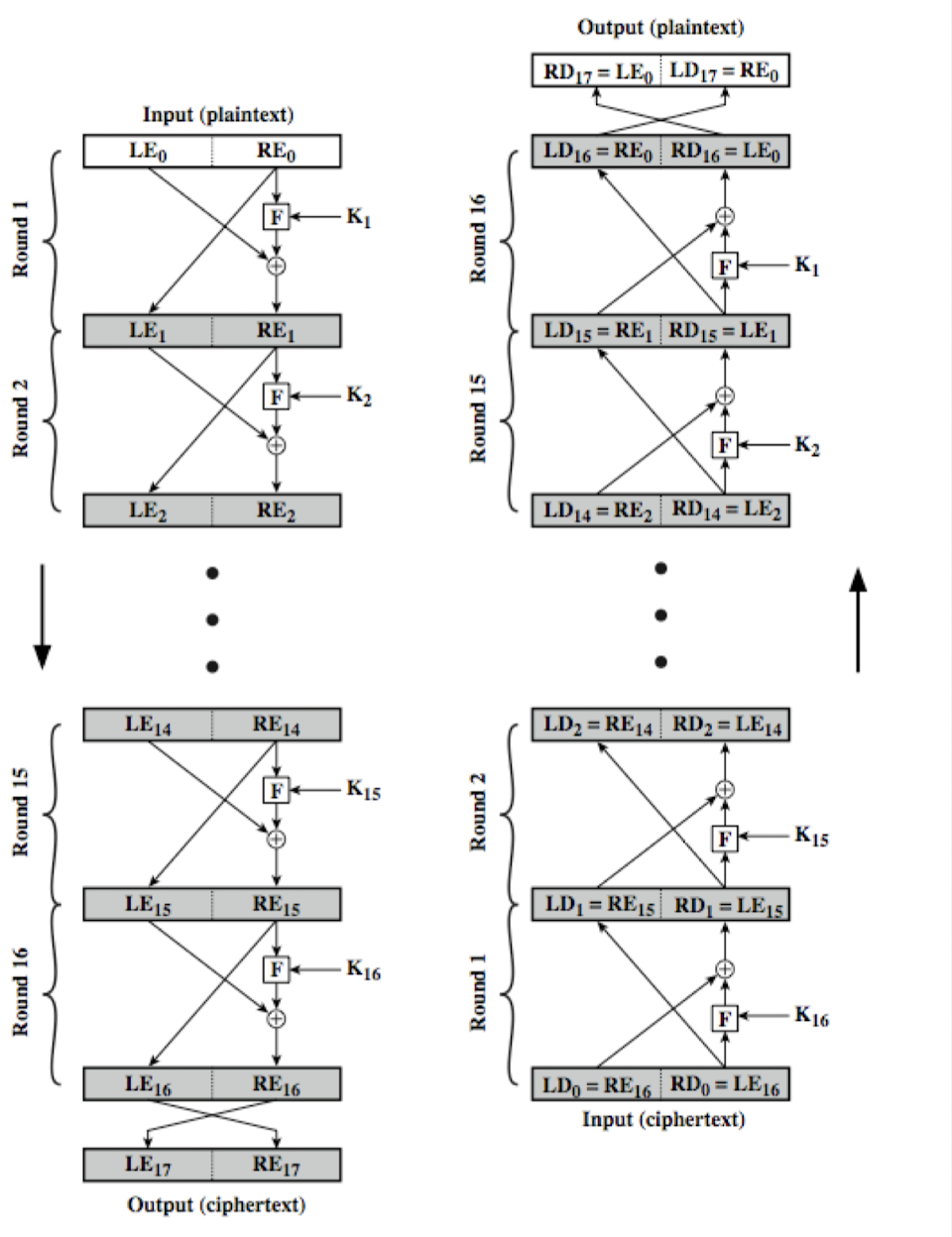핵심 질문: 역연산 불가능한 유닛이 있는데 어떻게 암호화와 복호화가 서로의 역이 될 수 있는가? Feistel은 이들이 상쇄될 수 있음을 보였다.