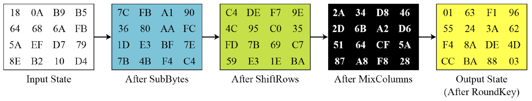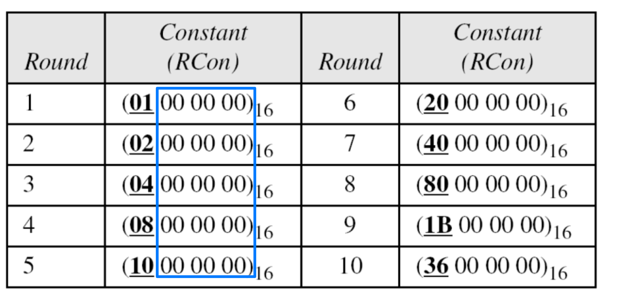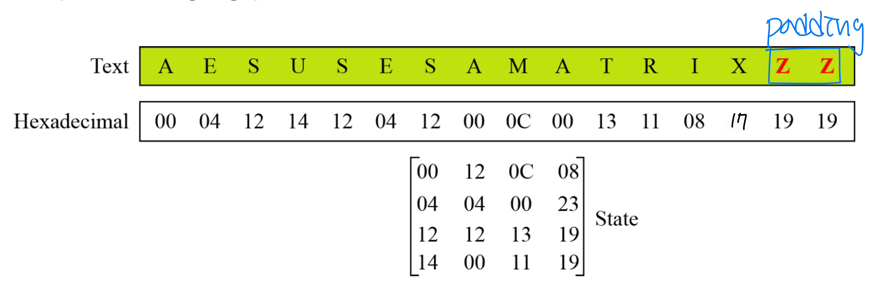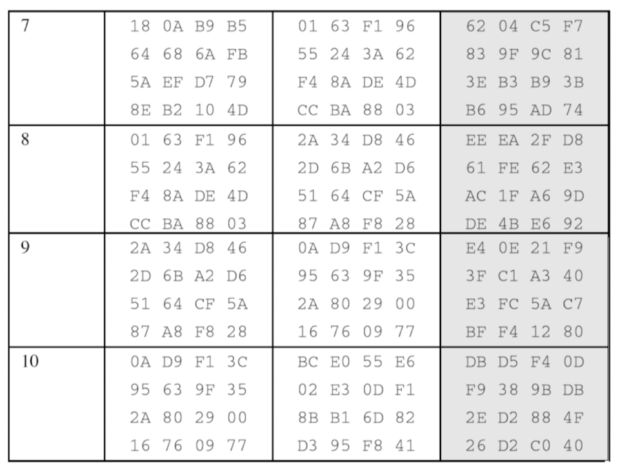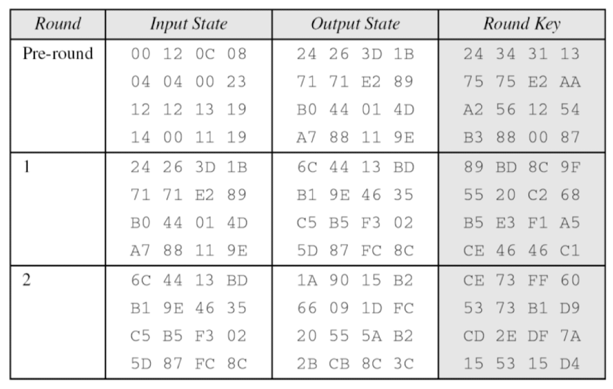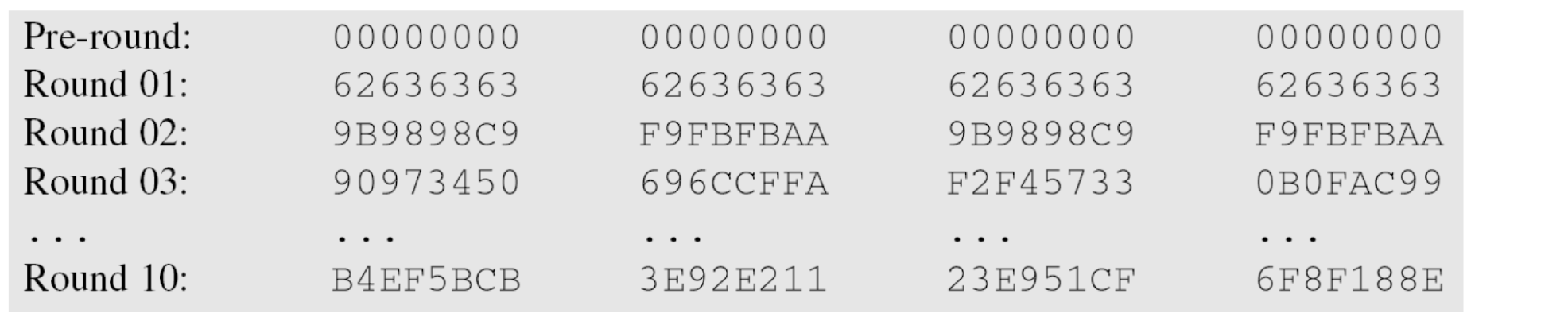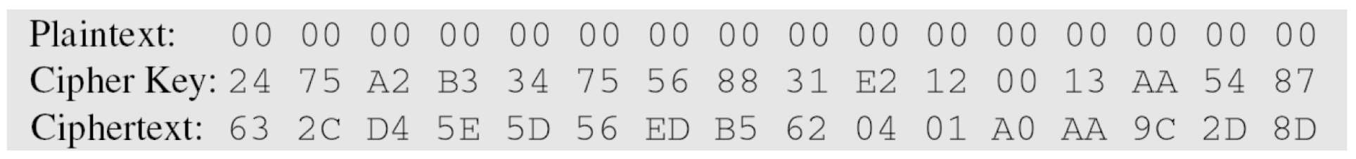 평문이 모두 0일 때의 암호화 결과. 이전 예제의 암호키를 사용하면: