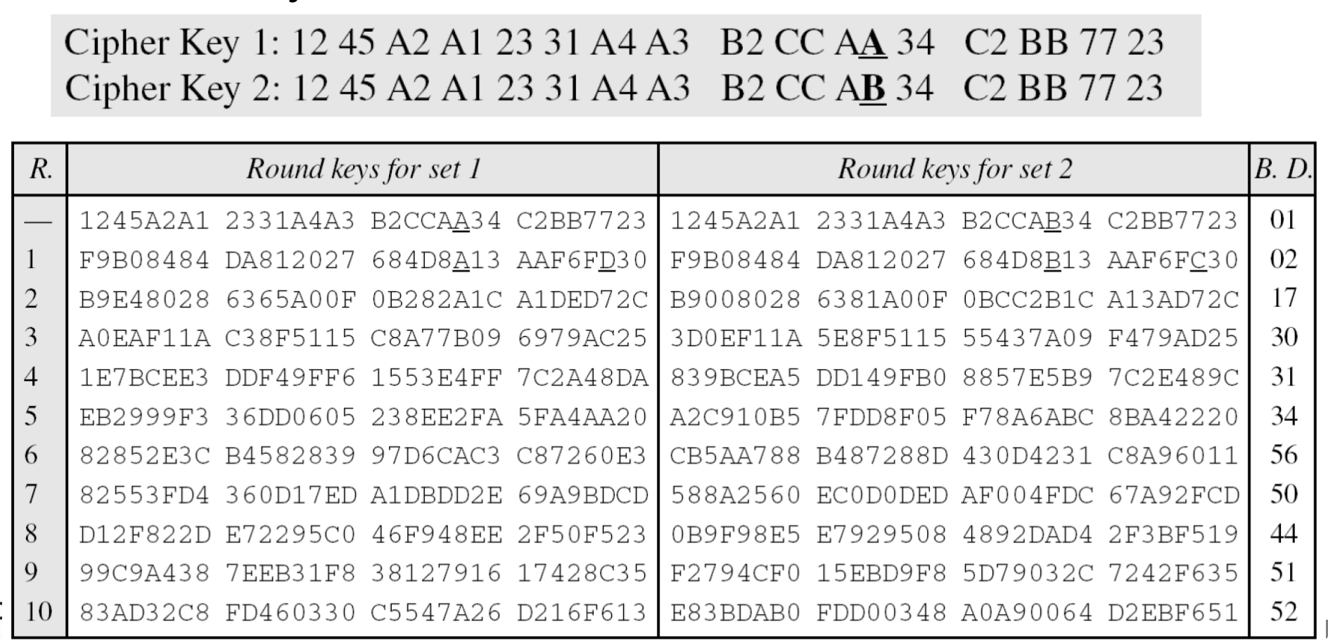 한 비트만 다른 두 암호키로부터 두 세트의 라운드 키가 생성될 수 있다: